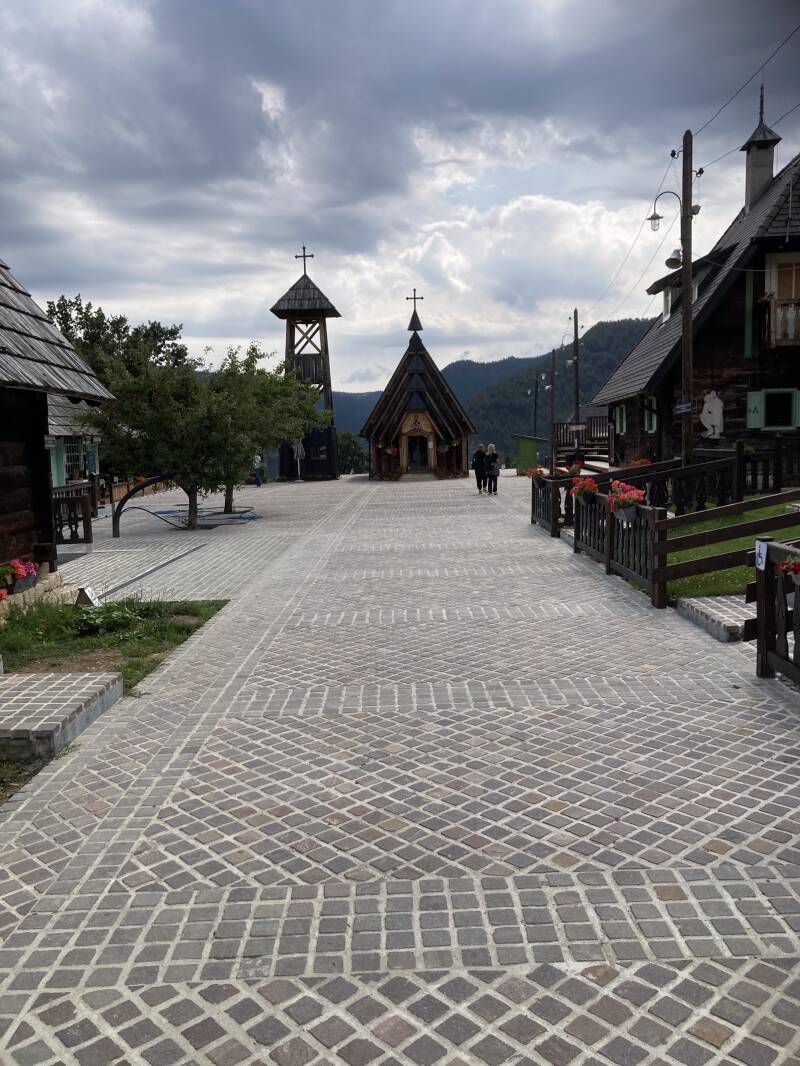 Ik herken de steile weg omhoog naar Kustendorf meteen. Op het eerste zicht lijkt het dorp nog zoals ik het me herinner uit 2015 maar naarmate ik er dwars doorheen in het rond kuier hink ik constant op twee gedachten: ofwel is er behoorlijk wat nieuwe infrastructuur aan het dorp toegevoegd en is de site uitgebreid ofwel herinner ik mij een aantal dingen gewoon niet meer. Where is Hermanos when you need him? Ik laat het allemaal rustig bezinken over een koffie en wat water op een van de vele terrassen. Hoewel grotendeels herkenbaar blijft het toch een imposant gegeven: op deze schilderachtige locatie een volledig in hout opgetrokken nederzetting optrekken met alle faciliteiten en functies die je maar kan bedenken, en dat in combinatie met de stenen stad Andricgrad in mijn uitvalsbasis Visegrad. Il faut le faire. En zeggen dat bij ons in het Westen niemand – een paar excentrieke zonderlingen niet ten na gesproken – daar enige weet, kennis of besef van heeft.