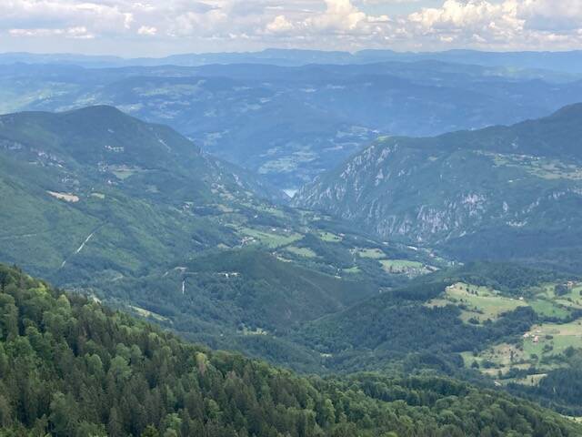 Ik rij naar de uithoek van het Tara Park waar zich het huis op de Drina bevindt. Van daaruit volg ik de Drina om dan gaandeweg de bergen in te duiken. Uiteindelijk ga ik off track via een sterk stijgend door losse stenen tot bergpad gepromoveerd spoor door het bos omhoog tot bij het Sjenic Viewpoint. Van hieruit zie je het Tara bergmassief en de kloof over de drie landen waarover het zich uitstrekt. De vergezichten zijn adembenemend. Dat ik even daarna weer zes kilometer onderaf door het stenen-bad moet tempert de vreugde wel wat. Maar ach, alles komt goed en ik ben blij dat ik uiteindelijk weer richting Visegrad kan. Het is 17u als ik binnen rij. Oma staat me aan de poort al op te wachten ;-)