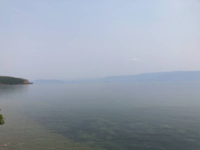 Het gaat het in Albanië beduidend minder snel vooruit. De weg Noordwaarts langs het Orhid-meer is reatief druk en de snelheid wordt er over de meeste stroken sterk gelimiteerd. Nadien gaat het landinwaarts richting Albesan. Deze route deed ik enkele jaren geleden toen de weg nog in aanleg was en Hilde achterop over het hele traject ettelijke rozenkransen weesgegroetjes bad opdat we leven en wel doorheen het modderbad zouden glijden. Vandaag is asfalt mijn deel maar de weg slingert, draait en keert. Het is er druk in beide richtingen. Ergst van al slaat de zon loden mokerslagen die op de rood geblakerde rotsen lijkt te weerkaatsen en voor een verschroeiende hitte zorgen. Ik ben blij en niet blij dat ik vanmorgen in Griekse-motard-modus ben vertrokken, met blote benen en blote armen en handen: nog meer kleren is nog heter, anderzijds brandt de zon op mijn huid en moet ik af en toe stoppen om een beschermende zalf te smeren die vervolgens weer een (plakkerige) film over de kuip van mijn Kawa legt.